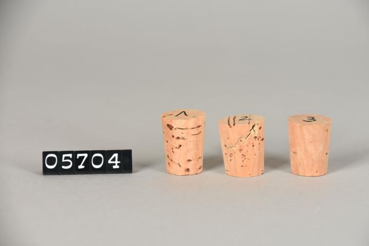 Verschiedene kleine Naturkorken für Enghalsgefäße, aus natürlicher Korkrinde gewonnen. Verschiedene Größen, rund, konisch verjüngend zusammenlaufend, d.h. der obere Durchmeser ist größer als der untere Durchmesser des Korkens. Für diese konischen Korken, Spitzkorken genannt, benötigt man kein Werkzeug zum Aufstecken. Unterschiedliche Qualitäten.