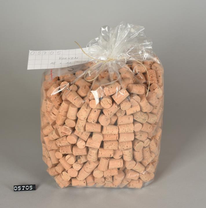 Verschiedene kleinere Naturkorken für Enghalsgefäße, aus natürlicher Korkrinde gewonnen. Verschiedene Größen, rund, konisch verjüngend zusammenlaufend, d.h. der obere Durchmeser ist größer als der untere Durchmesser des Korkens. Für diese konischen Korken, Spitzkorken genannt, benötigt man kein Werkzeug zum Aufstecken. Unterschiedliche Qualitäten.