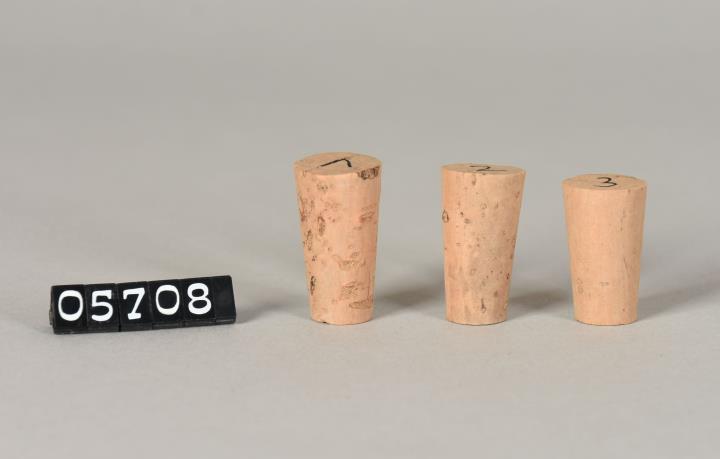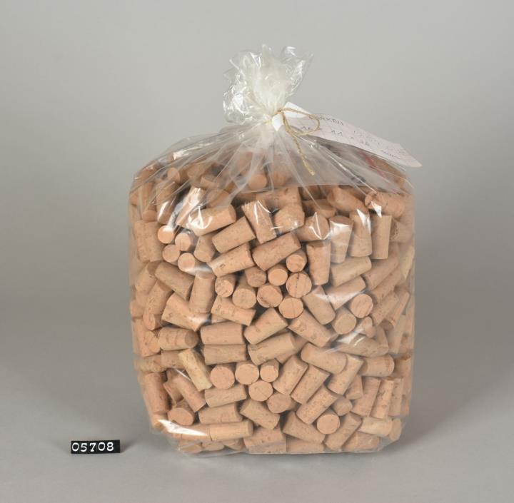 Verschiedene Naturkorken für Enghalsgefäße, aus natürlicher Korkrinde gewonnen. Verschiedene Größen, rund, konisch verjüngend zusammenlaufend, d.h. der obere Durchmeser ist größer als der untere Durchmesser des Korkens. Für diese konischen Korken, Spitzkorken genannt, benötigt man kein Werkzeug zum Aufstecken. Unterschiedliche Qualitäten.