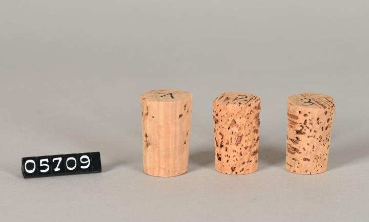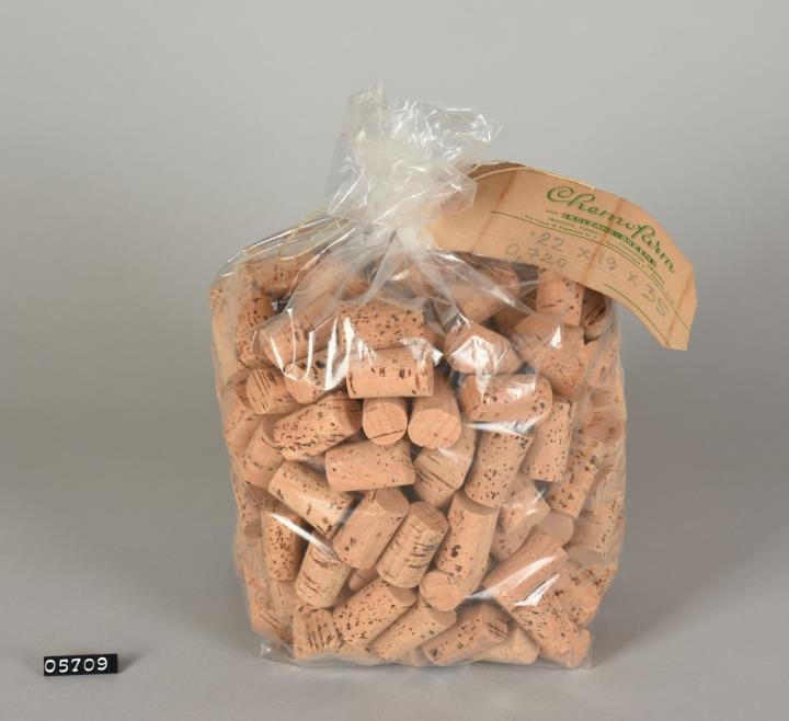 Verschiedene Naturkorken für Enghalsgefäße, aus natürlicher Korkrinde gewonnen. Verschiedene Größen, rund, konisch verjüngend zusammenlaufend, d.h. der obere Durchmeser ist größer als der untere Durchmesser des Korkens. Für diese konischen Korken, Spitzkorken genannt, benötigt man kein Werkzeug zum Aufstecken. Unterschiedliche Qualitäten. Mit Originalanhänger der Firma Chemofarm, Bozen.