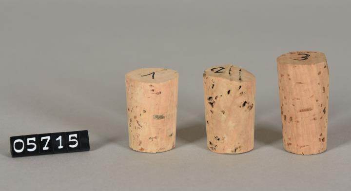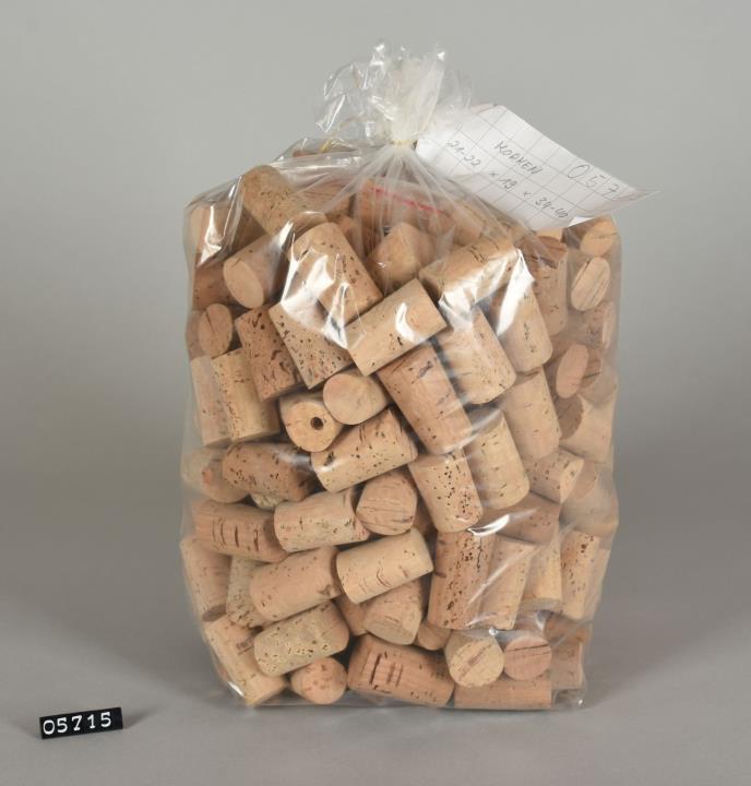 Verschiedene Naturkorken, aus natürlicher Korkrinde gewonnen. Verschiedene Größen, rund, konisch verjüngend zusammenlaufend, d.h. der obere Durchmeser ist größer als der untere Durchmesser des Korkens. Für diese konischen Korken, Spitzkorken genannt, benötigt man kein Werkzeug zum Aufstecken. Unterschiedliche Qualitäten.