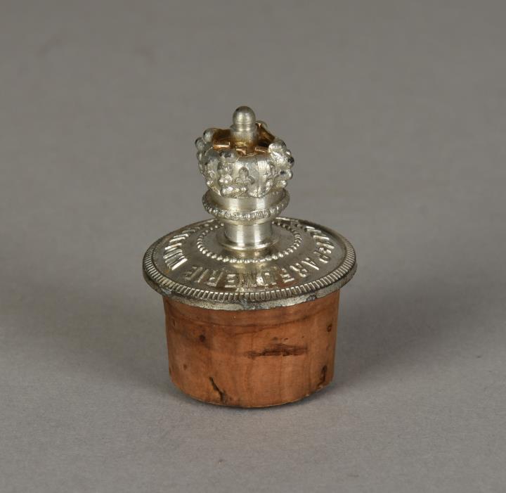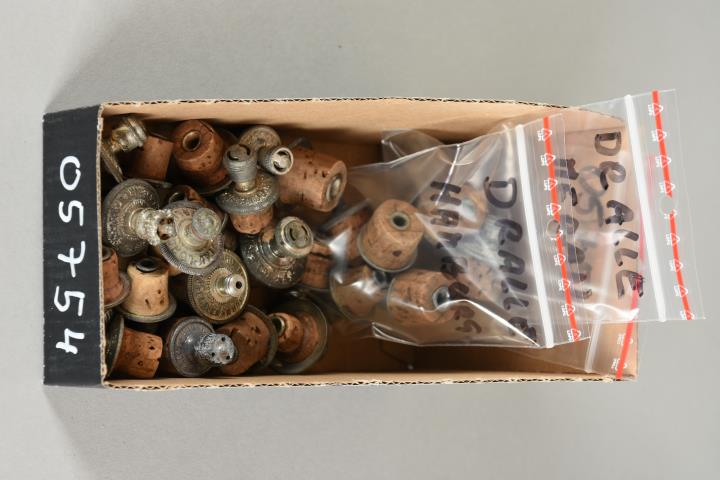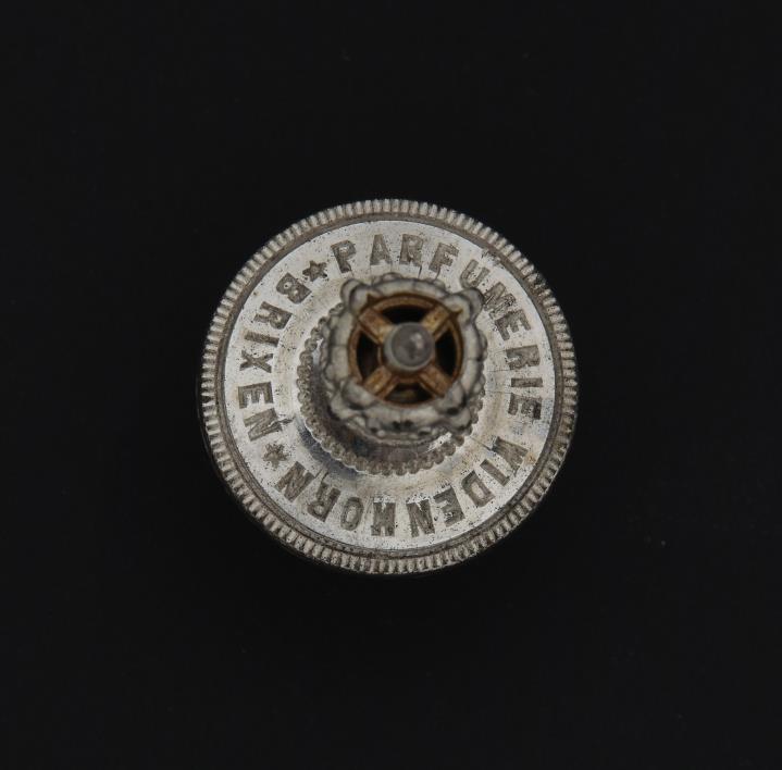 Gebrauchte Dosierverschlüsse aus Metall für Kosmetikflaschen wie Haarwasser, Parfüm etc. Gewinde am Auslass zum Dosieren der Flüssigkeit. Korkummantelung zum Aufstecken auf die Flaschen. Verschiedene gebrauchte Parfümflaschen-oder Haarwasserverschlüsse. Parfümerie Wiedenhorn, Brixen (5); Georg Dralle, Meran (2); Georg Dralle, Hamburg (7); Bergmann & Cie, Dresden (2); Parfumerie du monde elegant (2); Gustav Lohse, Berlin; Odonat, F. Wolf & Sohn; B. Tochtermann, München;M. Wallace, Drogist; A. Migone & C., Milano; Tricolilina; A. Brioschi & C. , Milano; Clermont & E. Fouet; Parfümerie 4711;