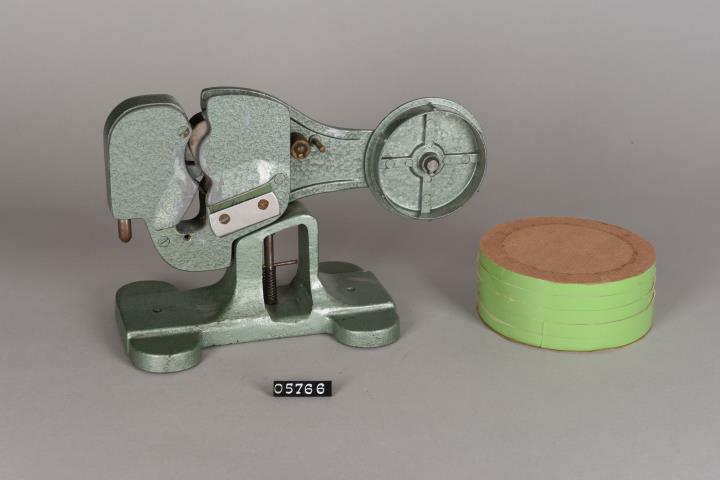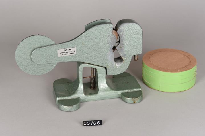 Schweres Gerät um schnellem Verschließen aller Kunstoffbeutel mit gedrehter Oberseite mit Selbstklebeband. Standfüße haben je ein Loch zum Verschrauben auf einer Tischplattemit bzw. eine Gummiauflage gegen das Verrutschen. Klebeetikett mit Hersteller oder Imprteur: MP 19 G. Ringesten & Co K.B. Stockholm Sweden. Mit fünf grünen PVC-Klebebändern je 9 mm breit.